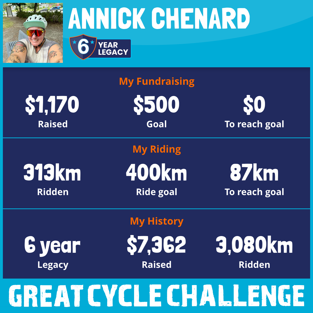 313 km Ridden$1,170 Raised2026