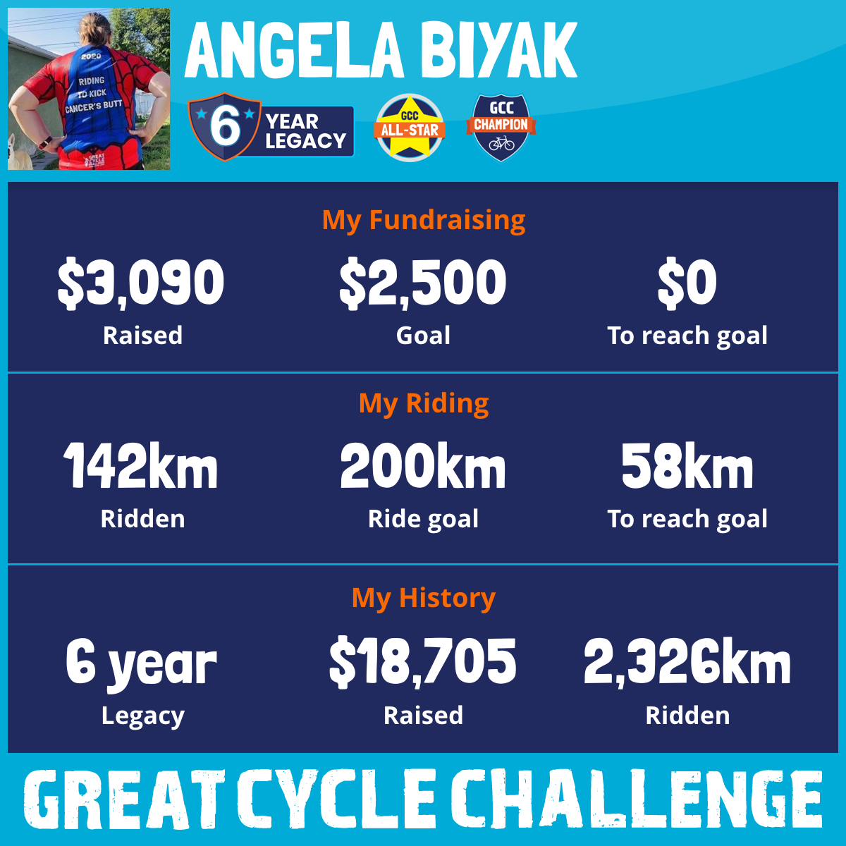 This August, I am taking part in the Great Cycle Challenge to fight kids' cancer! This will be my 6th year participating.