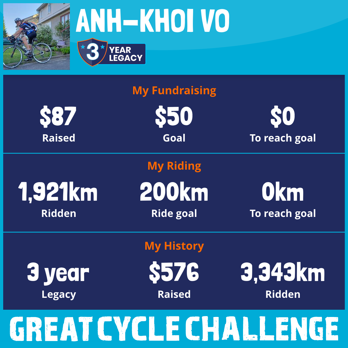 I am riding 200 km for my brother, Anh Tri Vo. Please sponsor me and support my challenge to fight kids' cancer and save little lives.