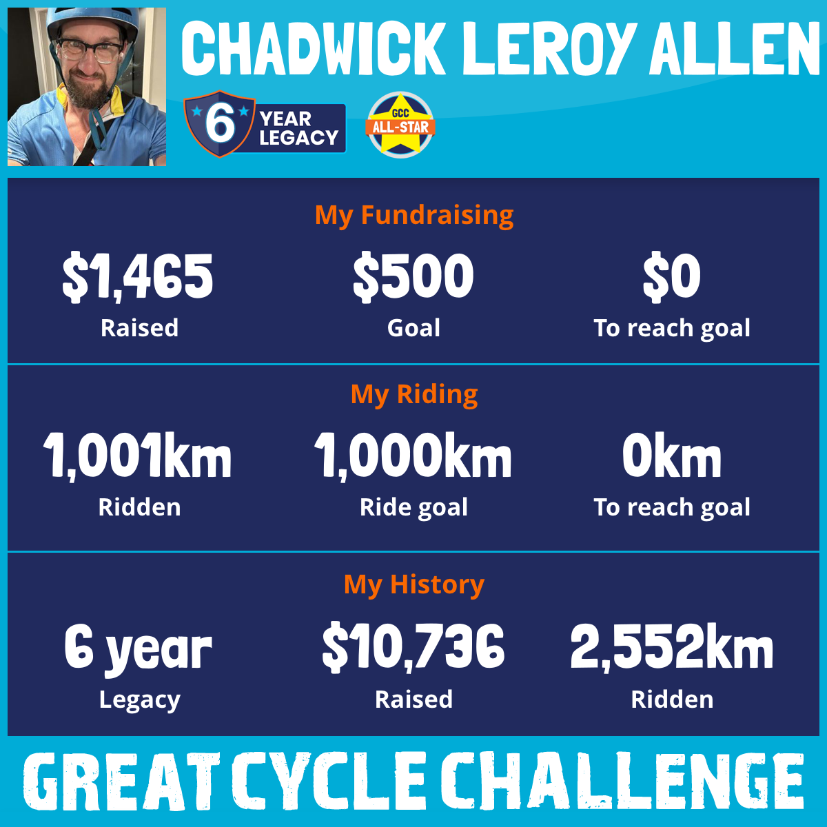 1,001 km Ridden$1,465 Raised2026