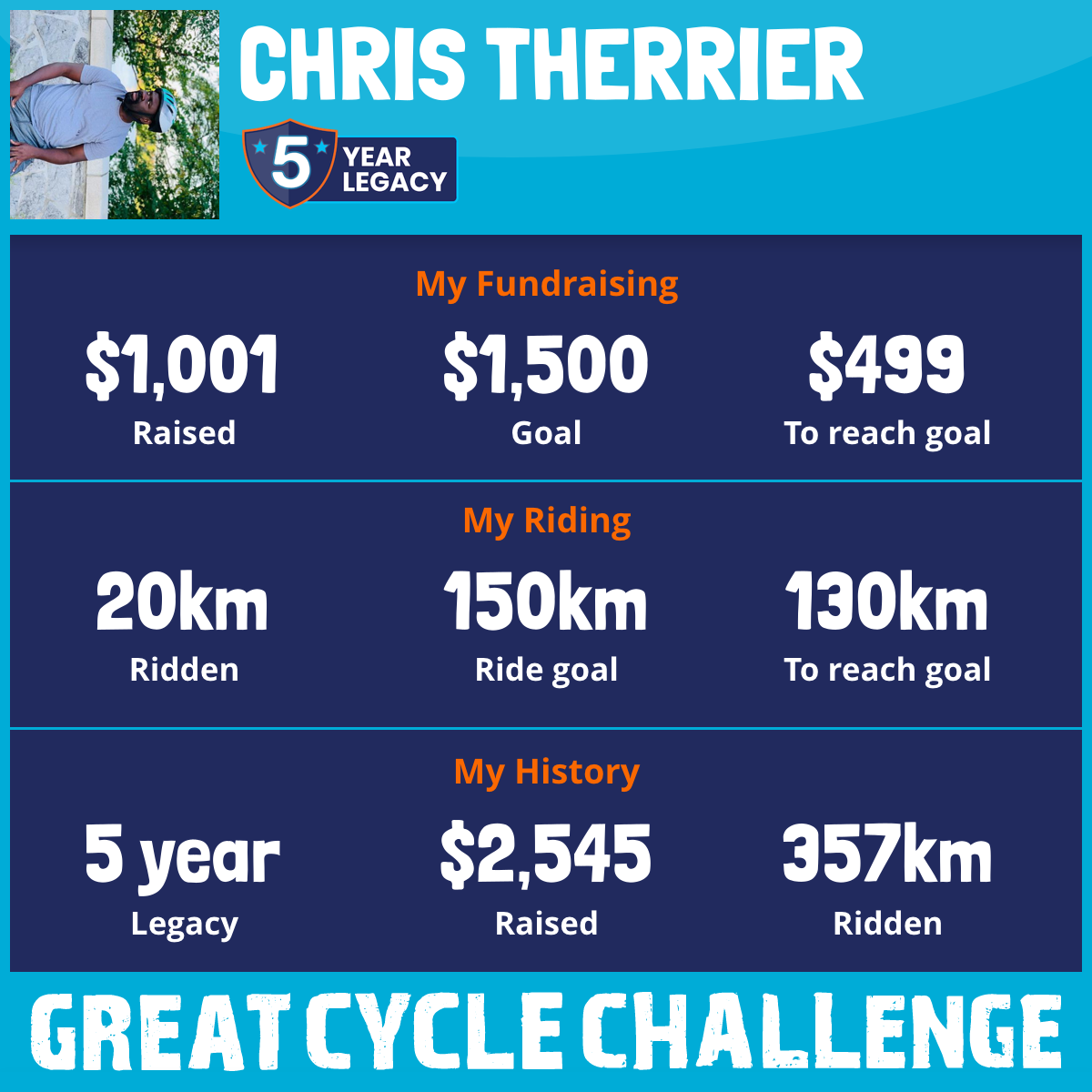 337 km Ridden$1,087 Raised2020