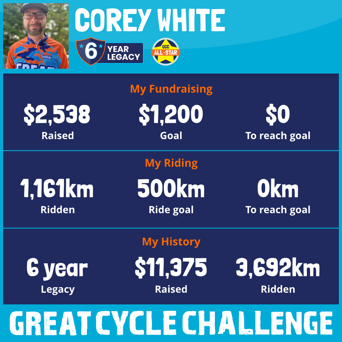 1,161 km Ridden$2,538 Raised2026