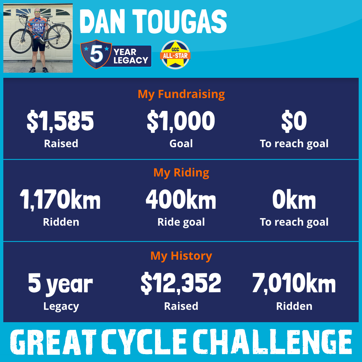 1,195 km Ridden$1,585 Raised2025