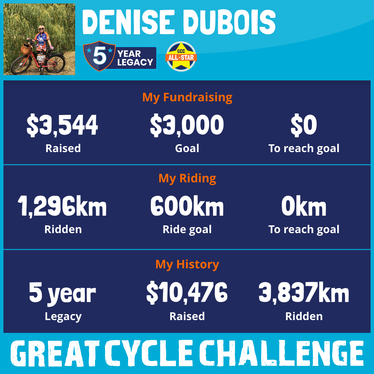1,296 km Ridden$3,544 Raised2025