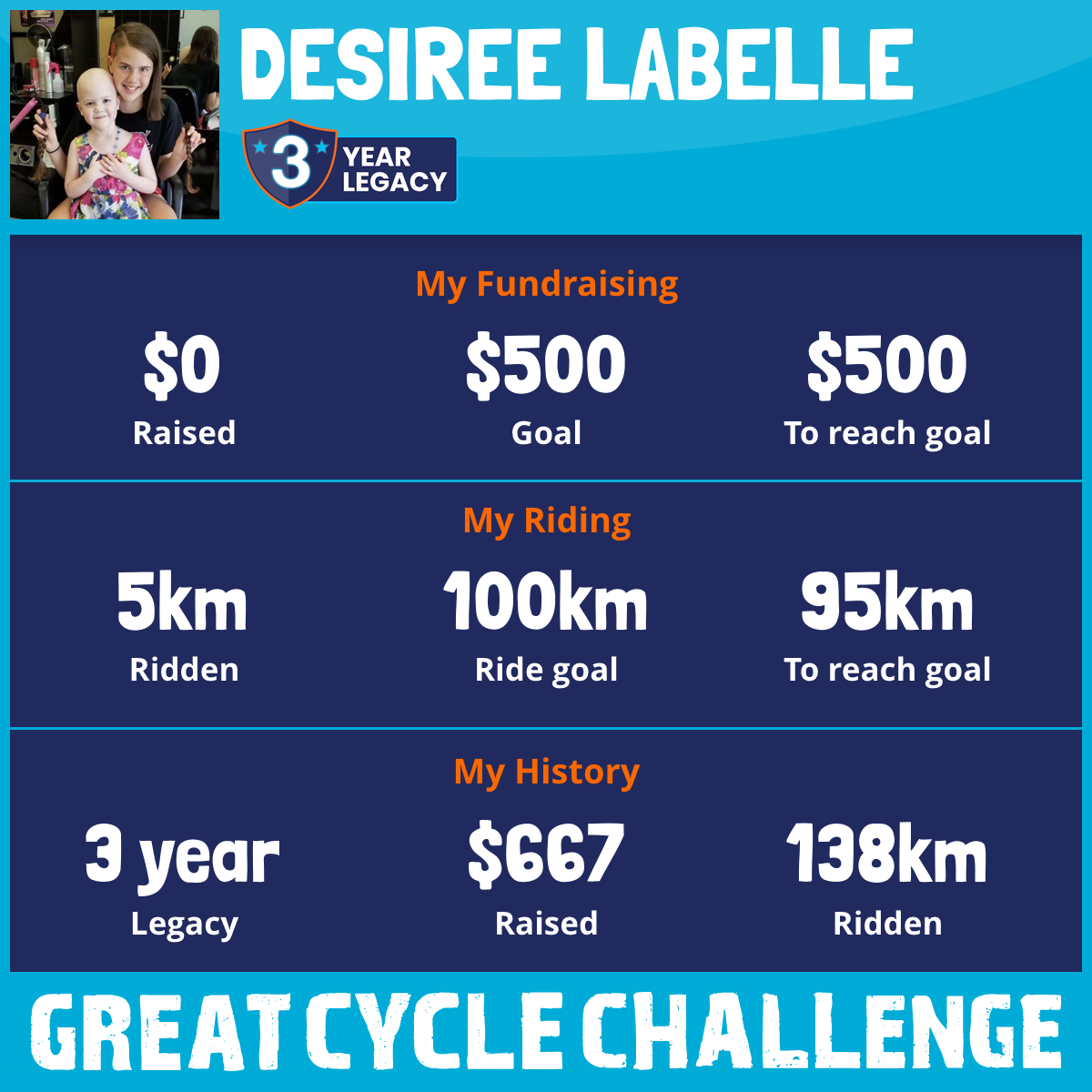 I am riding 100 km for Cassandra Labelle. Please sponsor me and support my challenge to fight kids' cancer and save little lives.