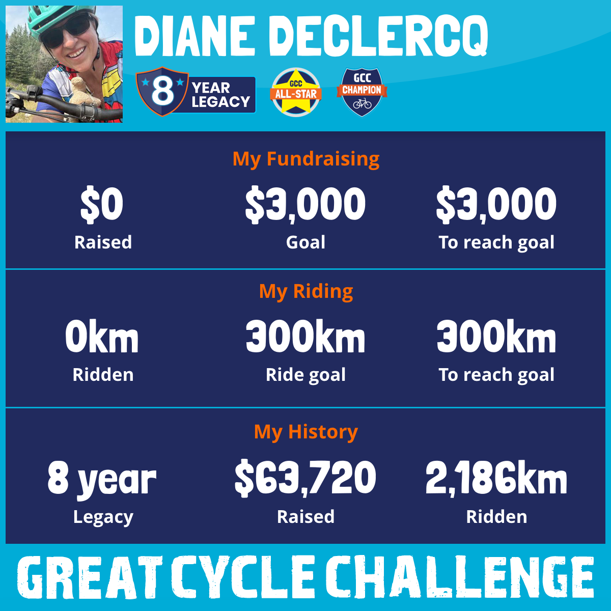 To the littles and their families faced with this journey, I proudly pull my bike out and take on the 2024 Great Cycle Challenge. This is my 7th year, with 2186 logged kms, endless training kms, and over $63,000 raised so grateful knowing together we are making a difference. I continue to be inspired by the kids who are fighting this battle, and the hope that these efforts give their families. The stories shared by the families I know, and the families I have met are both heartbreaking and heartwarming, it is an honor to be a part of this challenge with the hope for bright, healthy futures for these littles. Kids should be living life, not fighting for it! I also ride in memory of GMA "I am proud about you" who fought the battle and supported my efforts in making a difference.