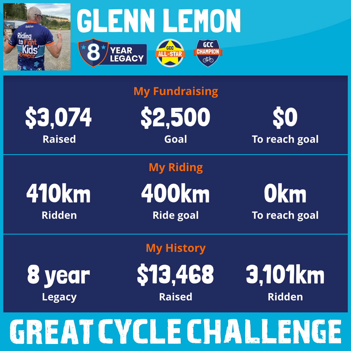 410 km Ridden$3,074 Raised2025