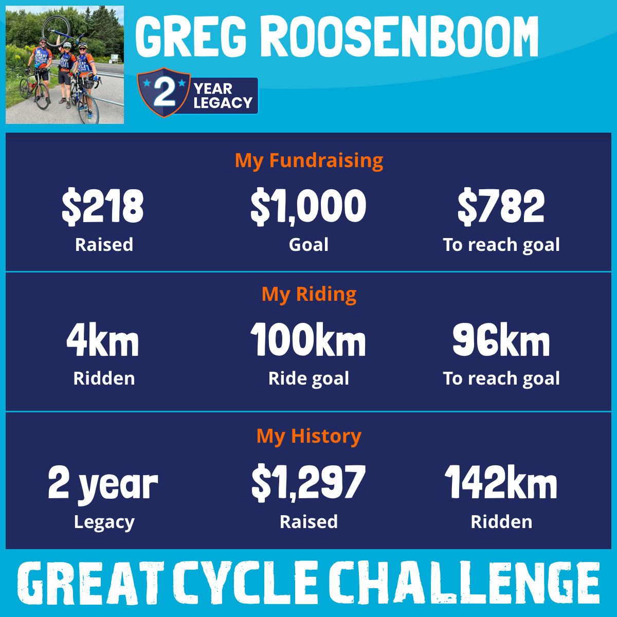 139 km Ridden$1,079 Raised2023