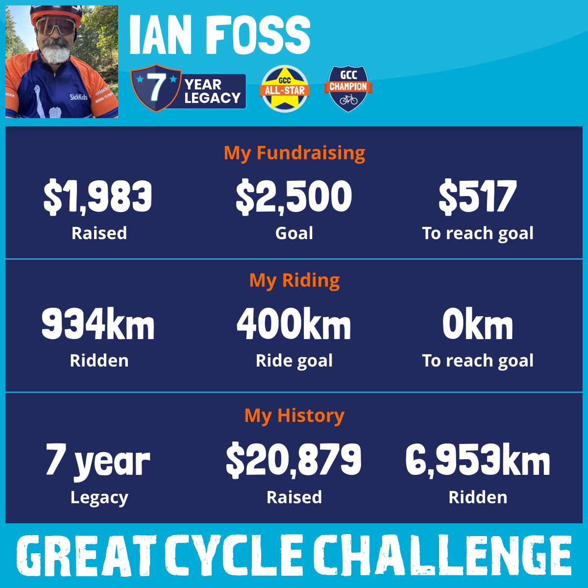 I am truly grateful to participate in the Great Cycle Challenge for the seventh year to fight kids' cancer. Over the past five years, with your support, I have raised over $19,000 while cycling over 6,000km.