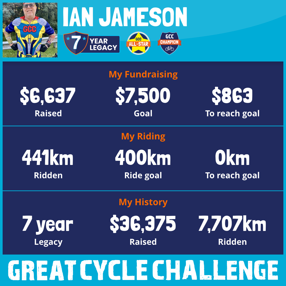 This August I am taking part for the seventh time in the Great Cycle Challenge to fight kids' cancer! In 2024 I was able to ride over 900 km for the Great Cycle Challenge and with your help I was able to raise $7,504. This year due to a fractured hip injury from a slip and fall on the black ice in my driveway in February I am hoping to be able to ride 400 km or more and raise another $7,500.