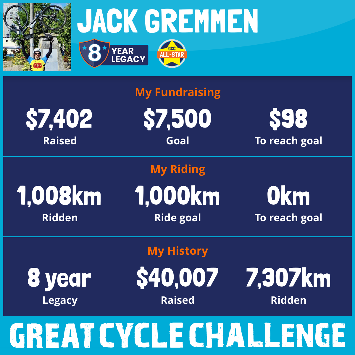 1,008 km Ridden$7,402 Raised2025
