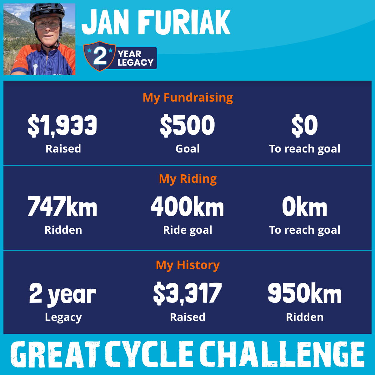 This August, I am taking part in the Great Cycle Challenge to fight kids' cancer! I’m riding in memory of Mike Engeland. Mike participated for many years and raised thousands of dollars for Sick Kids. Mike got me started last year and this year I promised his wife to keep it going. Mike lost his own battle this past spring. Thanks.
