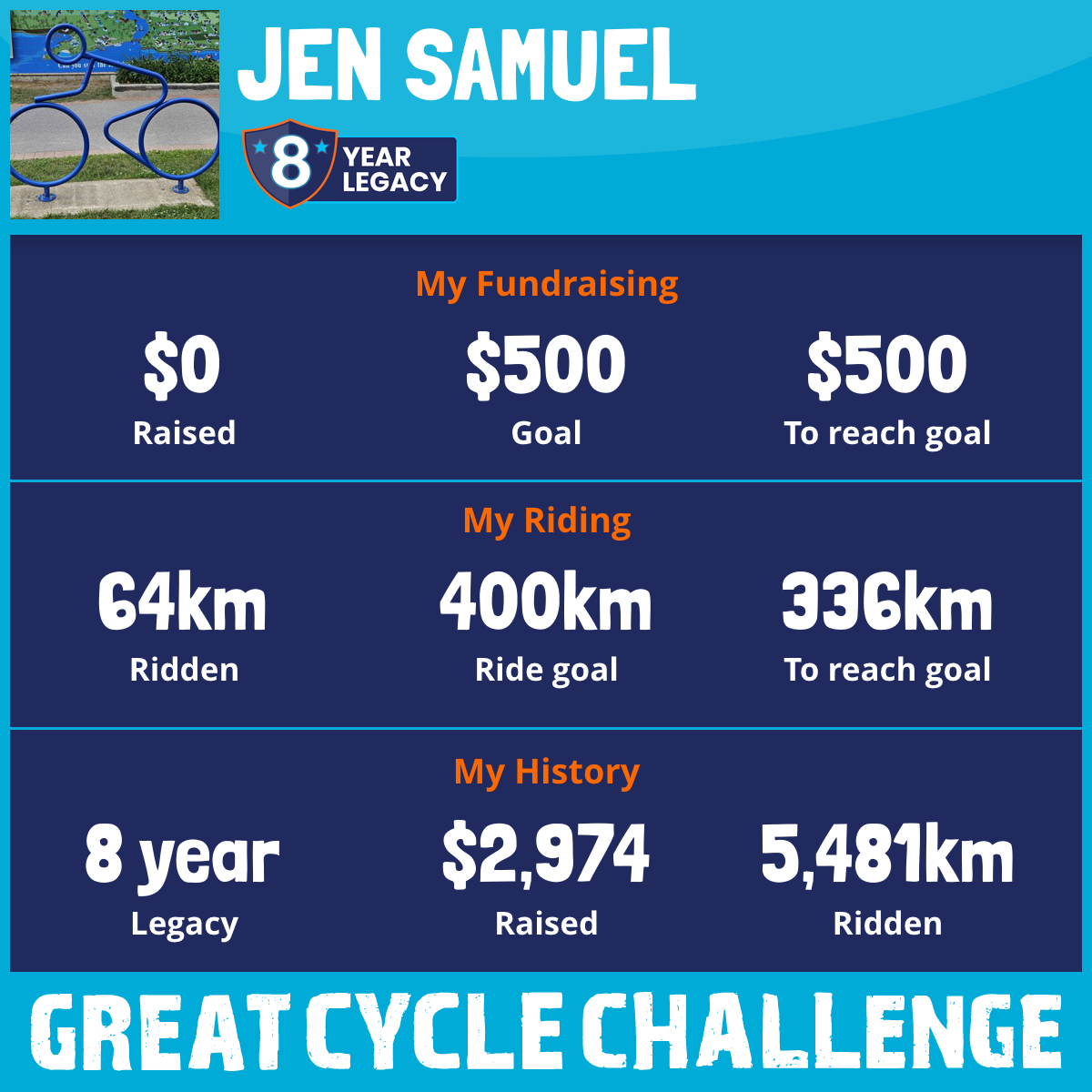 This August, will be my 6th year riding for the Great Cycle Challenge. The ride this year is special as I will be riding for Liam this amazing kid who has inspired me everyday since I met him . He has taught me nothing is impossible you just might have to do it differently.