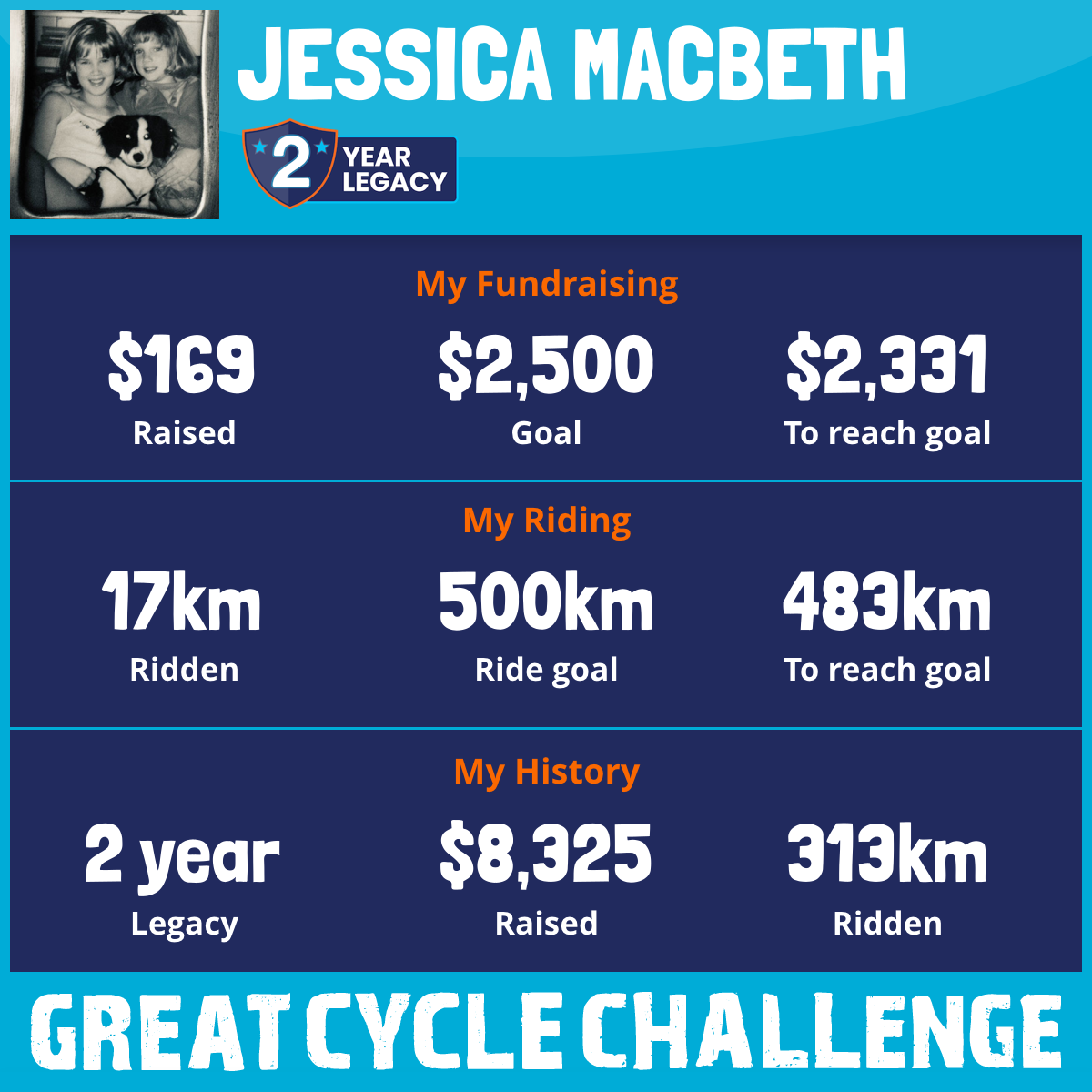 This August, I am taking part in the Great Cycle Challenge to fight kids' cancer. I am doing this in memory of my sister Shauna who lost her life at the age of 15 after a courageous battle with childhood cancer.