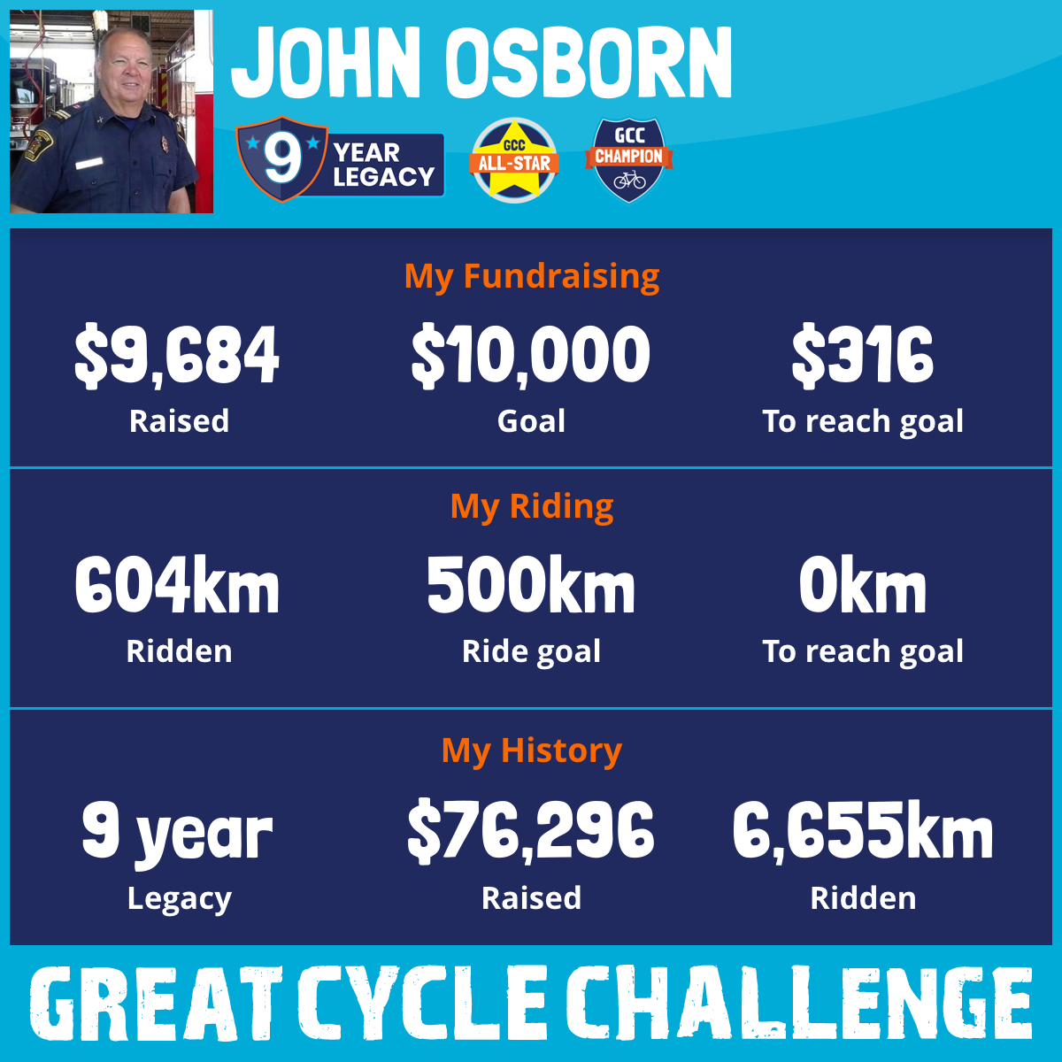I am pleased to announce my participation in the Great Cycle Challenge once more, a cause that I am deeply committed to supporting. This will be my ninth consecutive year participating in this remarkable event, during which I have amassed an impressive 6,051 kilometres and raised over $$67,845.19 I am immensely proud of the accomplishments I have achieved thus far, which are a testament to the unwavering support of my generous donors.
