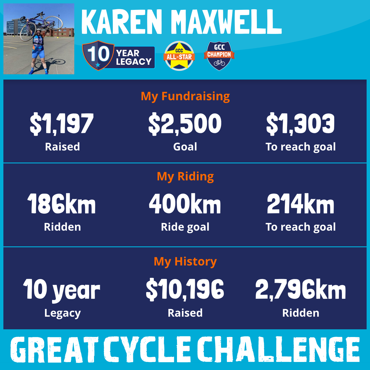 Karen has a goal to ride 400km in the month of August and to raise $1,000 from friends and family along the way.