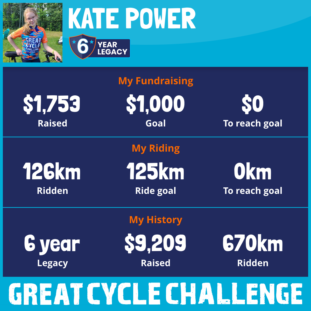 I really loved having the chance to help other kids the last 5 summers by doing the Great Cycle Challenge. I want to be able to make a difference in other kids' lives. No kids should have to live with cancer. Please donate so we can help the kids together.