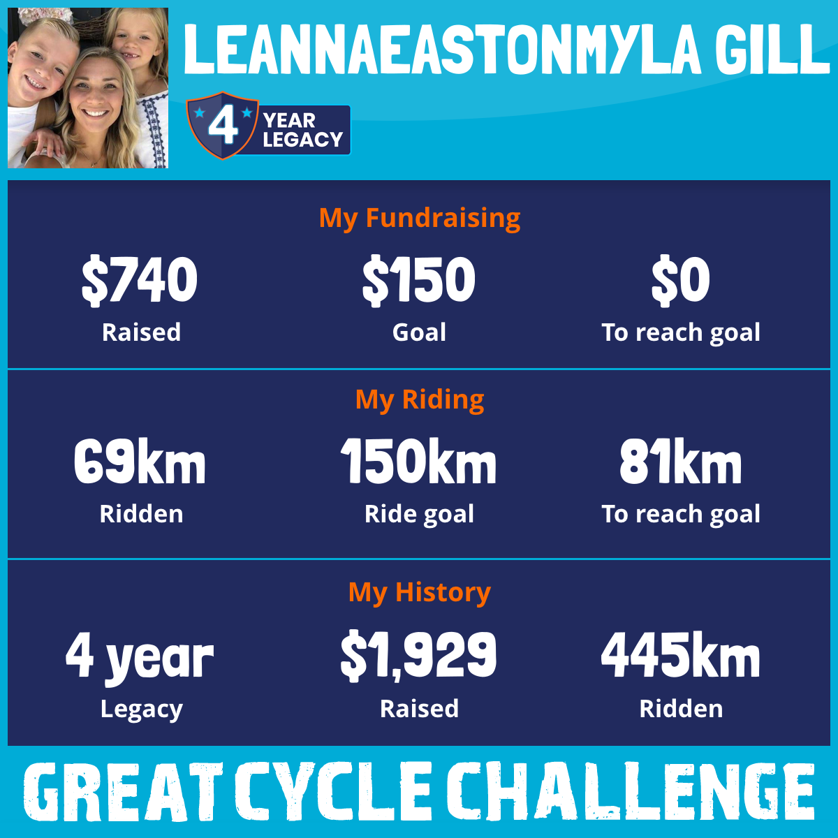 This August, Easton, Myla and I are taking part in the Great Cycle Challenge to fight kids' cancer! We will be biking over 150 kms in the month of August!
