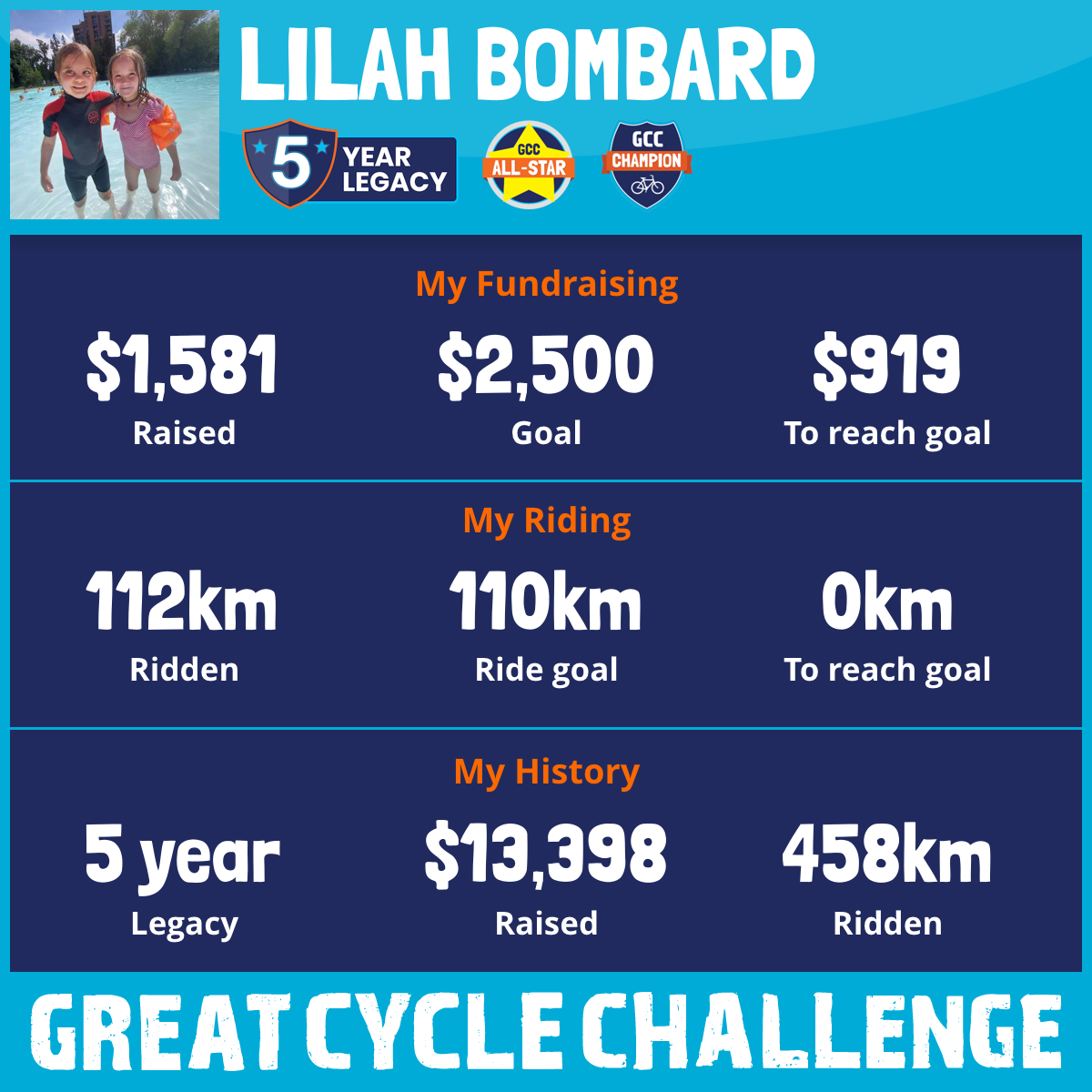 My best friend, Arya, died of brain cancer when she was just 6 years old. She was just about to turn 7 years old. I miss our adventures together and hope they can help kids with cancer so that they can live. Kids should always be able to have adventures. I am doing this biking adventure for Arya. Even though Arya was not able to turn 7 she still did so many fun things and had huge goals. She did challenges like 50 nights in a tent and she loved to achieve her goal. This riding goal is a way I can keep her memory alive and helps me think of her.