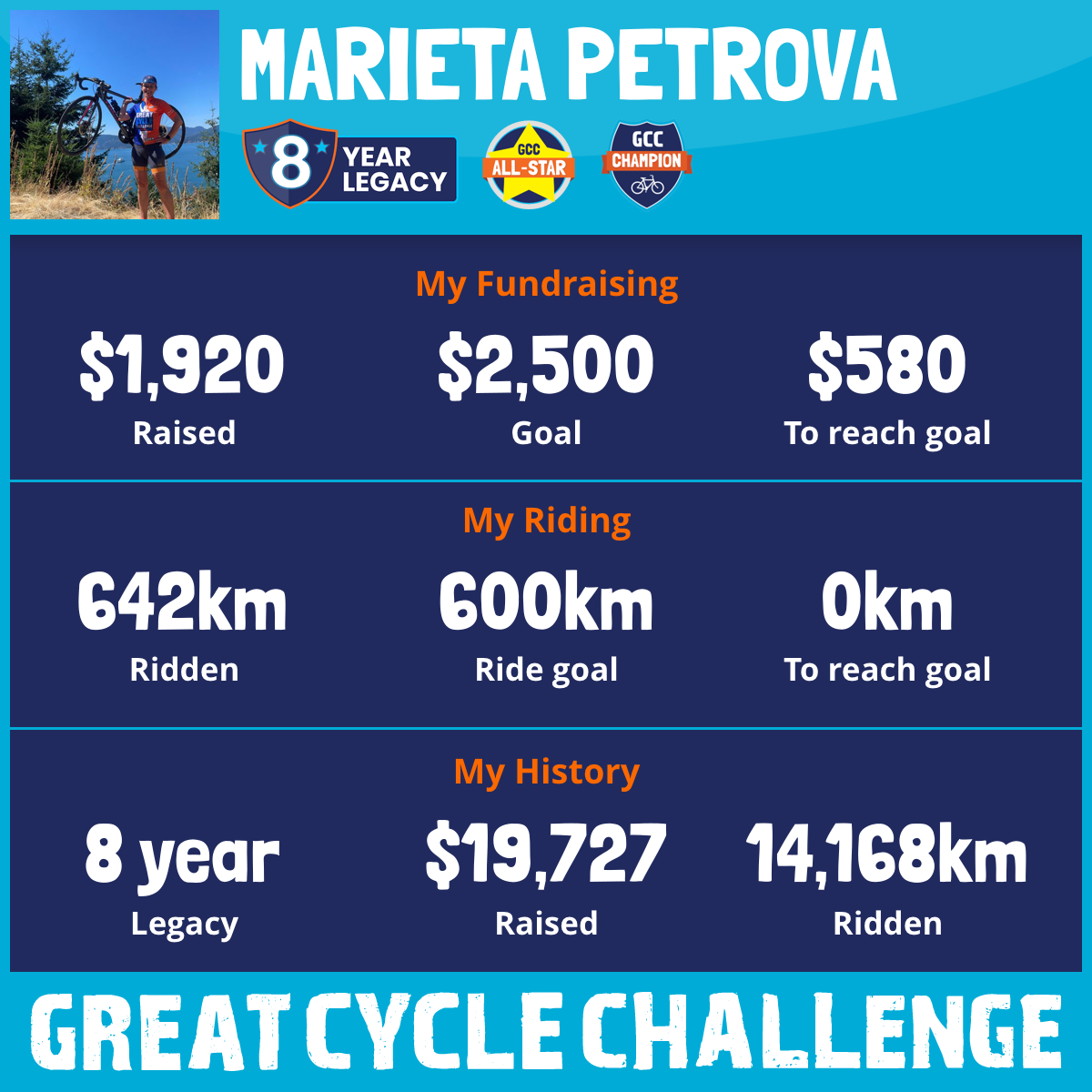 I am embarking on the journey of the Great Cycle Challenge this August, driven by an unwavering commitment to combat childhood cancer. Having triumphed over a 1024 km goal last year, I am now setting my sights on a target of 600 km throughout August 2025.