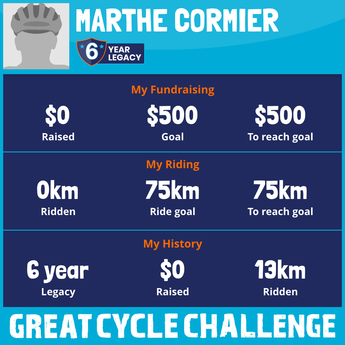I am riding 75 km for my friend, Dominique. Please sponsor me and support my challenge to fight kids' cancer and save little lives.
