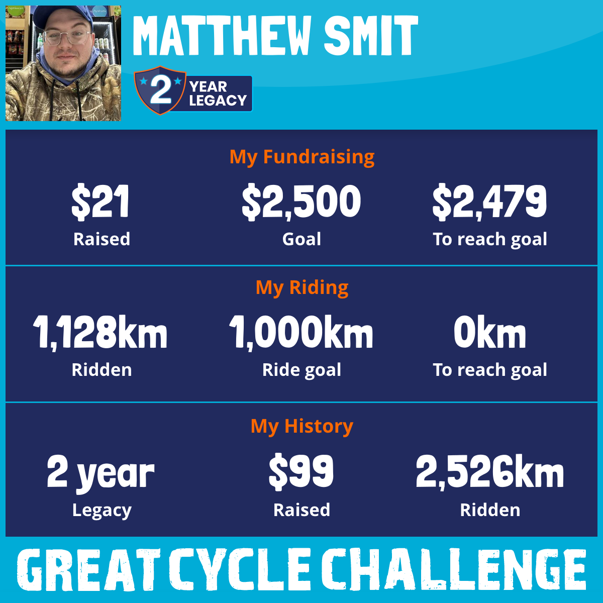 1,128 km Ridden$21 Raised2025