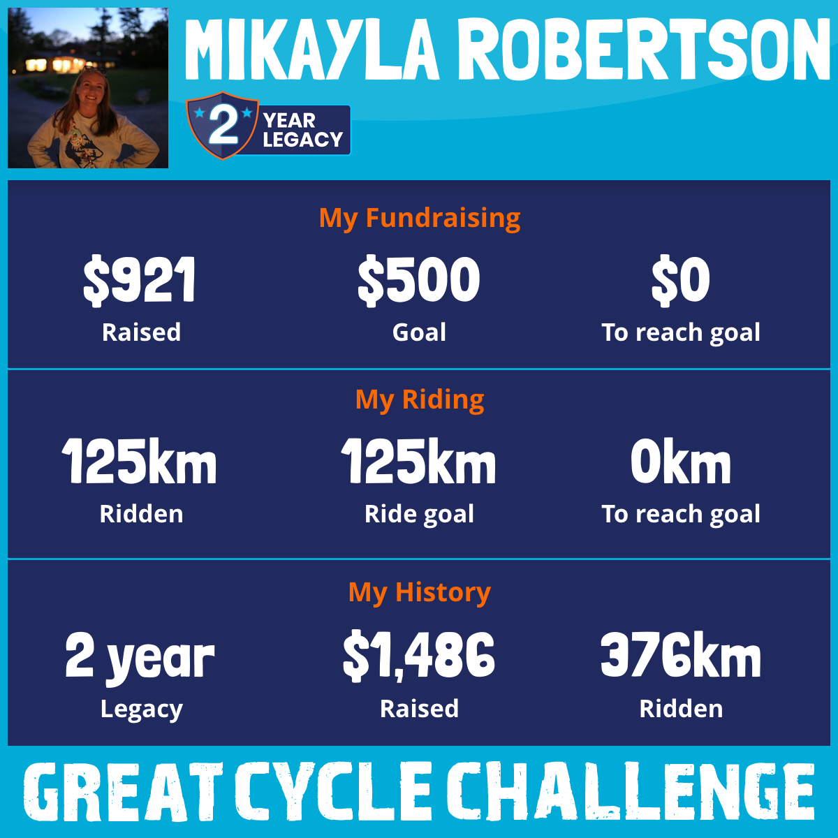 I am riding 125 km in memory of my mum, Kim Robertson. Please sponsor me and support my challenge to fight kids' cancer and save little lives.