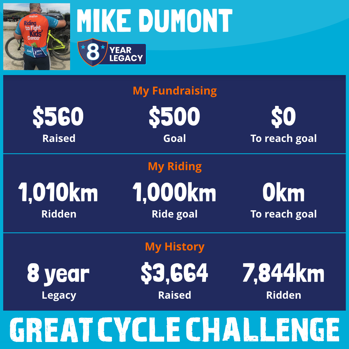 1,164 km Ridden$365 Raised2020