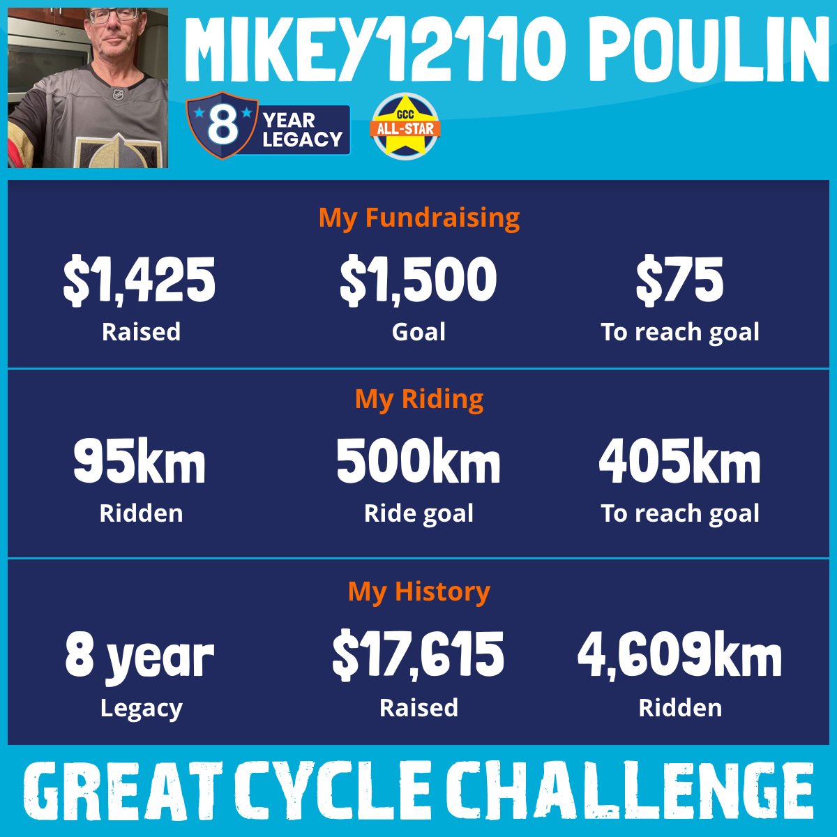 This year, I am taking part in the Great Cycle Challenge to fight kids' cancer!