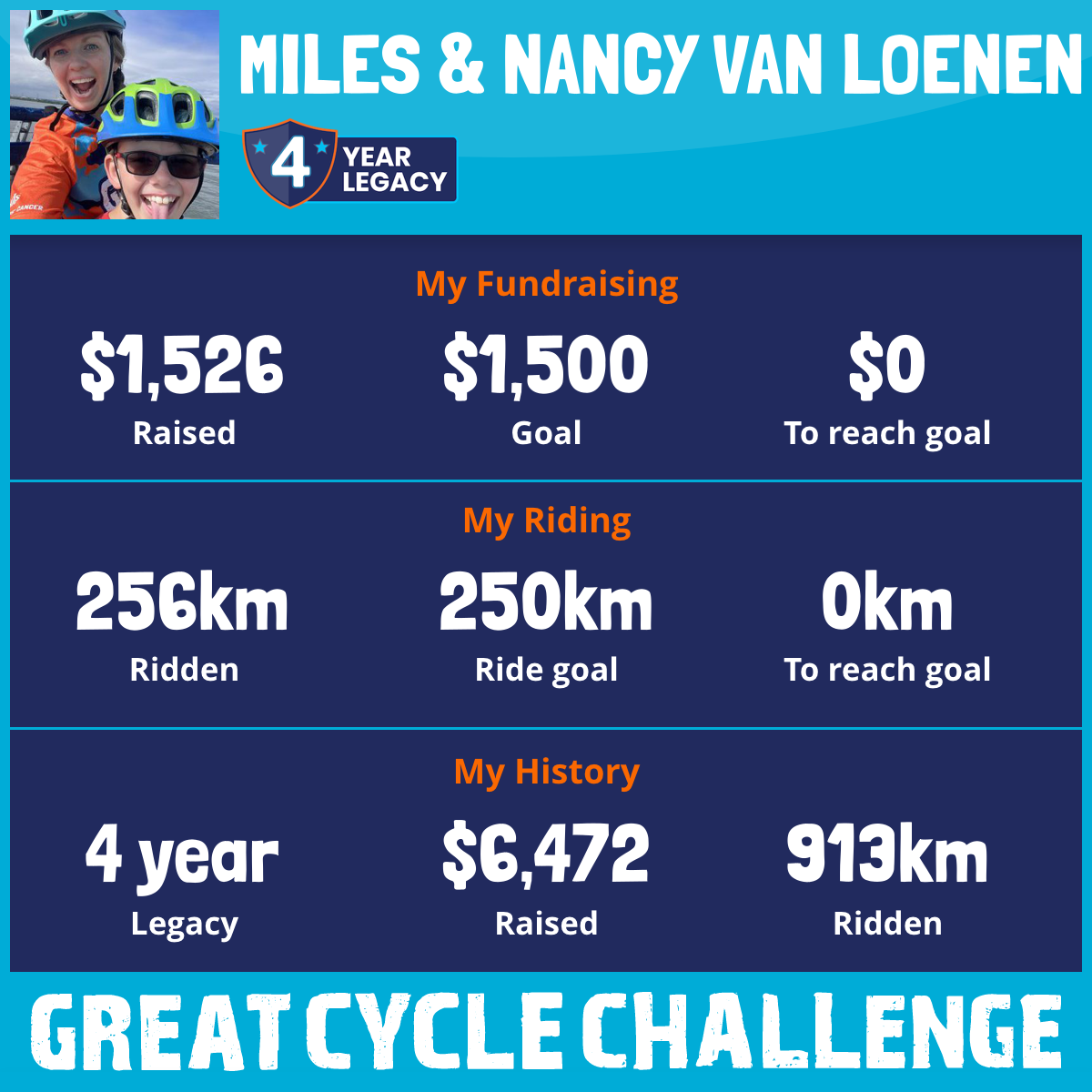 So far, we’ve logged 143 km and raised $1,176. Proud of Miles, grateful for the support, and excited to keep pedaling toward the finish line. Please share our mission with others!