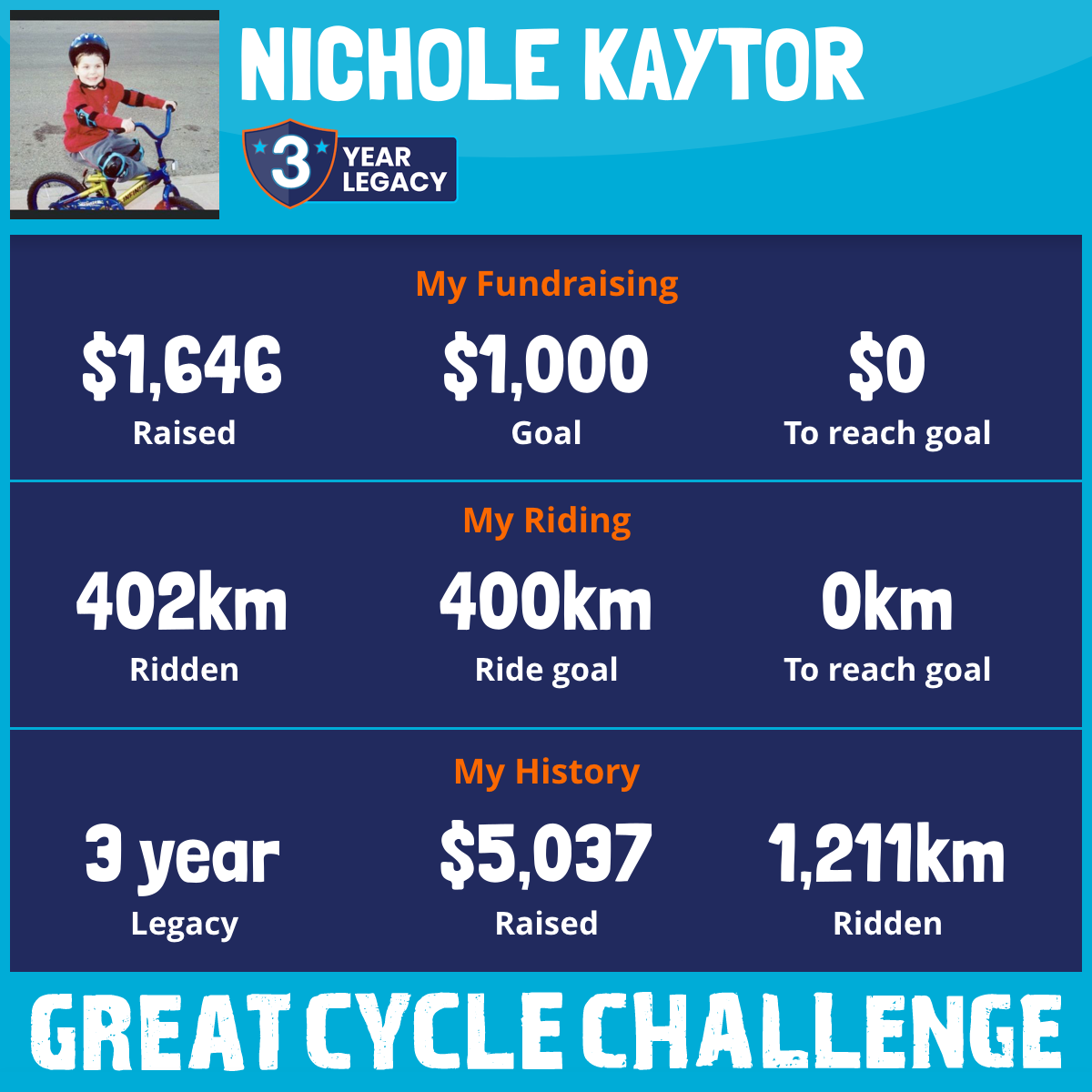 This August I am taking part in the Great Cycle Challenge to fight kids cancer in memory of my son Brayden. Our family lost Brayden to Burkitts Lymphoma in 2002. Not a day goes by that we don't think about him. My Dad has done this challenge in previous years and will be joining me for some rides. My goal is to raise $1000.00 and ride 350 km.
