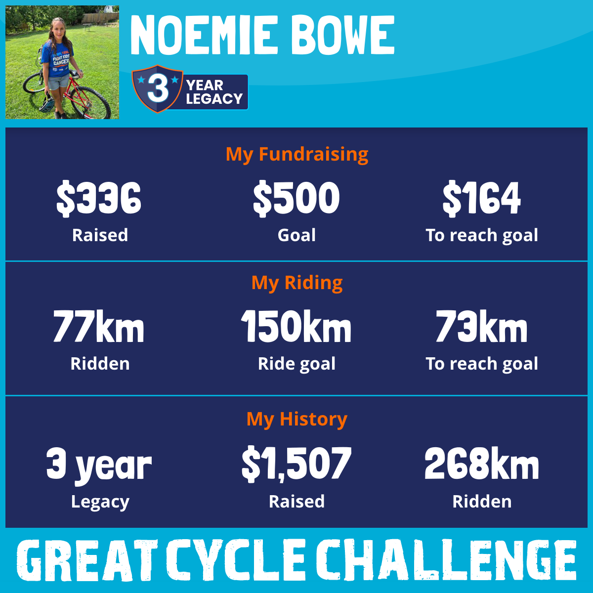 I'm 13 years old and I am once again taking part in the Great Cycle Challenge to fight kids' cancer!