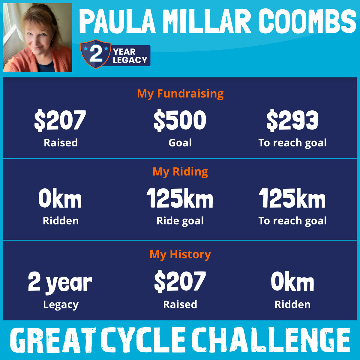 I am riding 125 km for my friend, My dad, Betty, Barb, Jody, Debbie, Aunties. Please sponsor me and support my challenge to fight kids' cancer and save little lives.