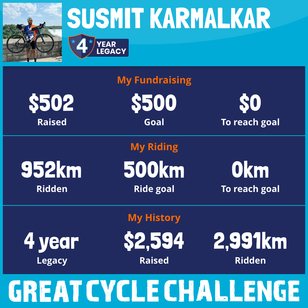 This is my 4th year in this challenge and I wish to continue for this amazing institution which works to better health of sick children. I feel fortunate to be associated with this institute and I am inspired by the work they do for health and wellbeing of children. I am blessed that myself and my closed ones haven't been touched by this deadly disease but I want to support Sickkids Foundation for this great cause, so I am here to ride and raise as much funds I can for this wonderful event. Everyone here is doing a wonderful job at this challenge. Kudos to every individual participant, team & sponsors
