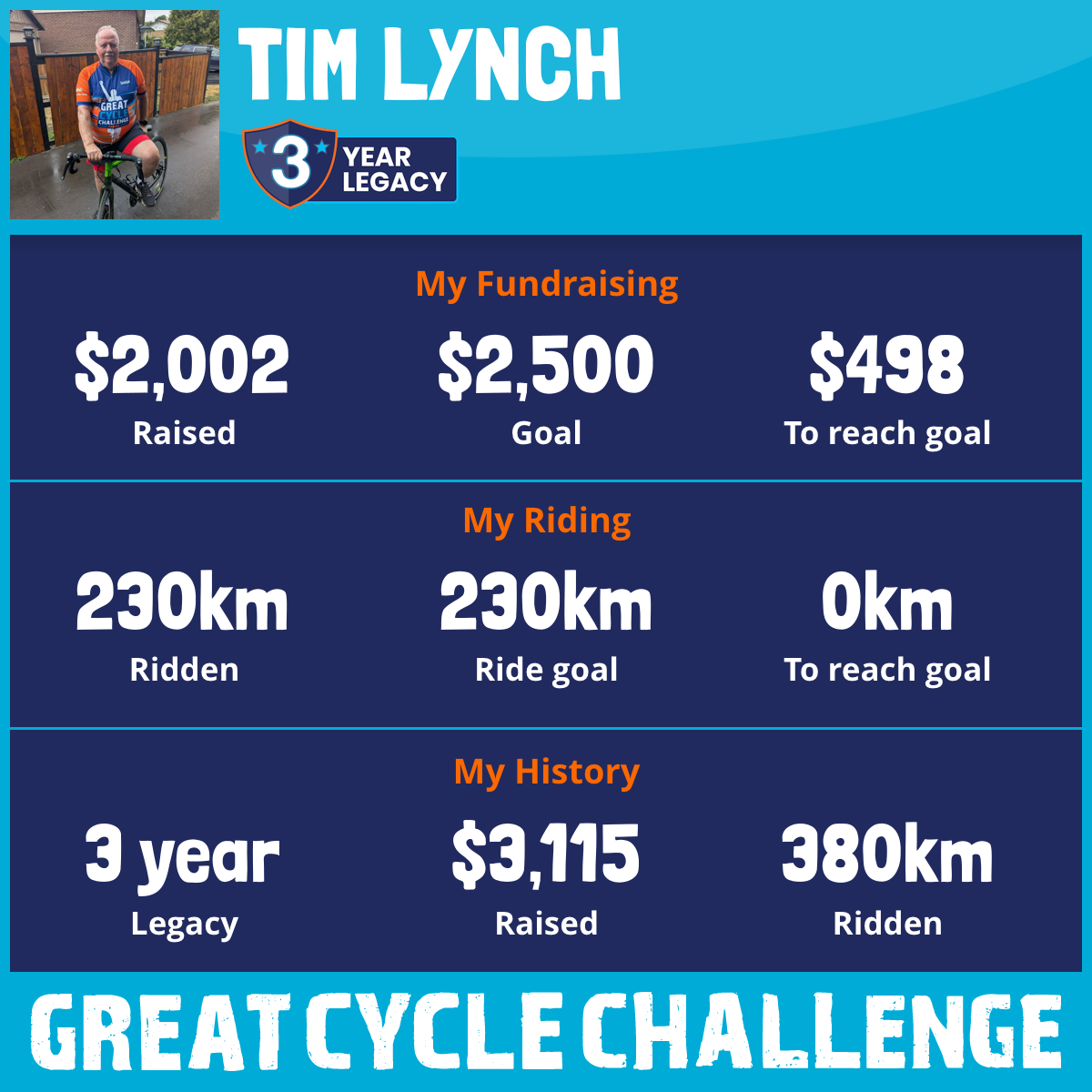 This year I am riding with Cancer as I was diagnosed in December 2024, I have committed to 230km but I plan to do more than that.