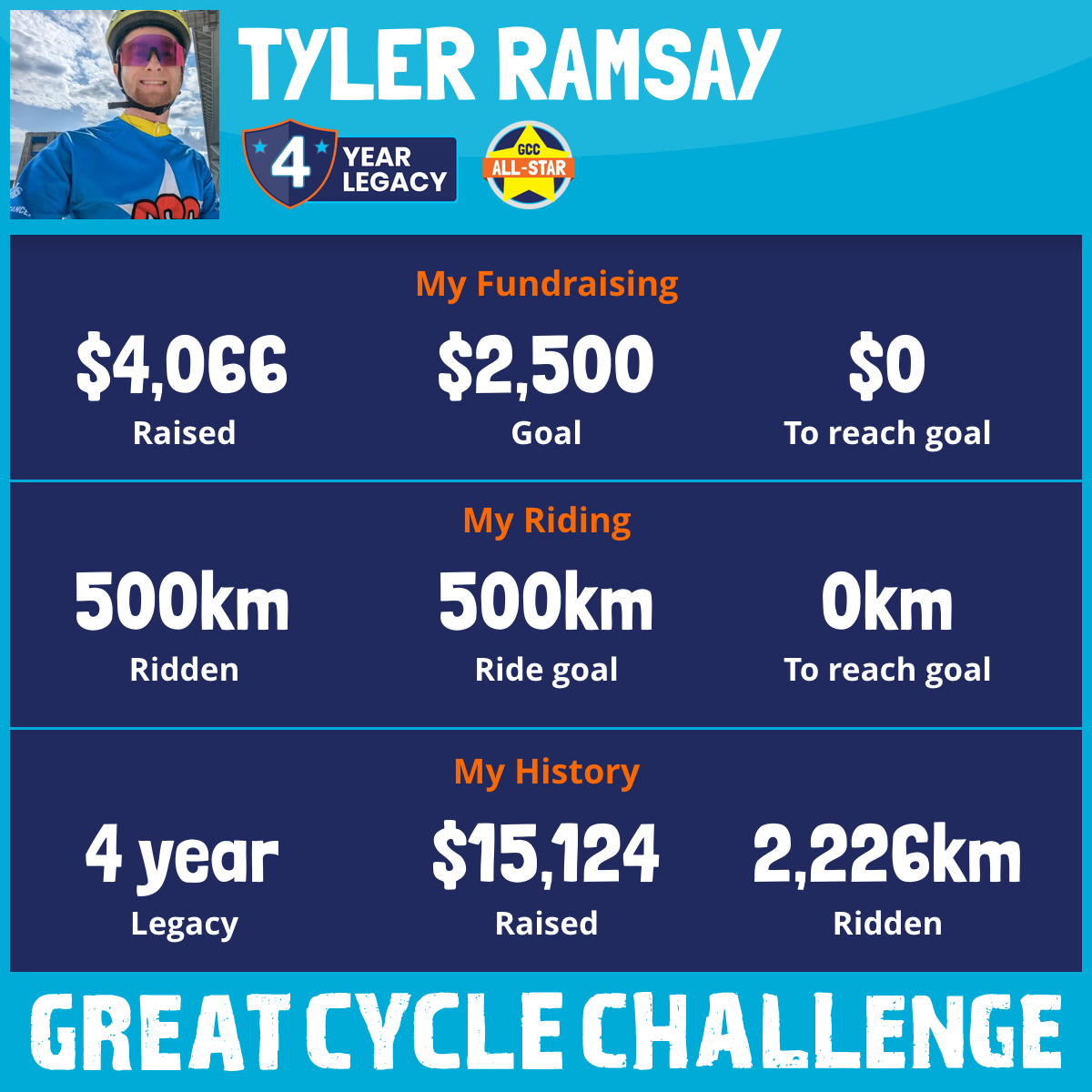 500 km Ridden$4,066 Raised2026