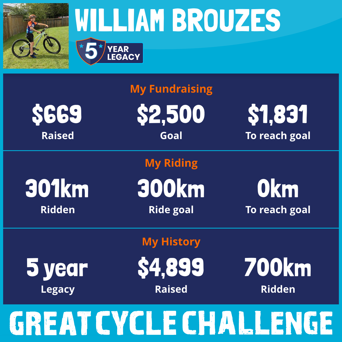 I’m Will, I’m 12, and this is my 5th year riding for cancer! This year I have big goals, help me reach them! Donate if you can, and wave if you see me riding!