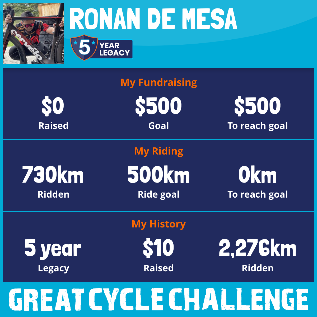 I am riding 500 km in memory of Precy de mesa. Please sponsor me and support my challenge to fight kids' cancer and save little lives.