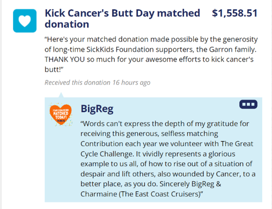 23 Jul 2025Do not be thrown off by the Team full off ZERO's? We choose to wait for the "KICK CANCERS BUTT DAY" historically Aug 8th to 14th, we expect it to fall the week of Aug 11th to 15th. this year? It was Aug 14th Last Year! This is when the Electronic Online Donations Received within that 24hr. period, up to DOUBLES! We are not a Big Toronto or Vancouver Corporate Team, so we need to make the most of this DOUBLE DONATION DAY and as best we can, hold our Donations for posting that day! I would never say no to a Donation, but I will kindly guide supporters to be on the LOOK OUT for a TEXT, EMAIL and Or FACEBOOK POST on KICK CANCERS BUTT DAY, Around Aug 14th. TBA and DONATE Then, letting them know, because they did that, their Donations will up to DOUBLE for the Kids!